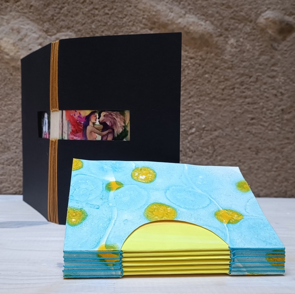 Le carnet « voyage dans le musée » vous permettra de créer une reliure à fenêtres et découpes offrant un aperçu des souvenirs graphiques du musée ! (plaquettes, posters d'expositions antérieures ou en cours)