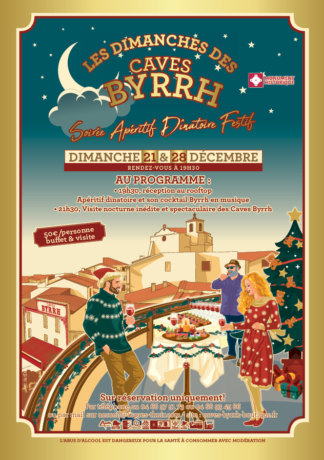 Au programme: -19h30: Réception rooftop : apéritif dînatoire et son cocktail Byrrh en musique. - 21h30: Visite nocturne inédite et spectaculaire des Caves Byrrh.