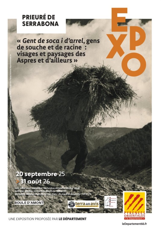 Descriptif de la manifestation : Le prieuré de Serrabone avec le Département 66 vous invite à venir découvrir cette exposition : « Gent de soca i d’arrel, gens de souche et de racine : visages et paysages des Aspres et d’ailleurs ». Exposition d’objets et de photographies grand format consacrée au patrimoine rural dans les moyennes montagnes des Pyrénées-Orientales. Essentiellement basée sur des archives photographiques, le propos de l’exposition est tiré principalement de publications locales : Quand on avait tant de racines d’Adrienne Cazeilles et Le Boulès : ma vallée de René Payré.