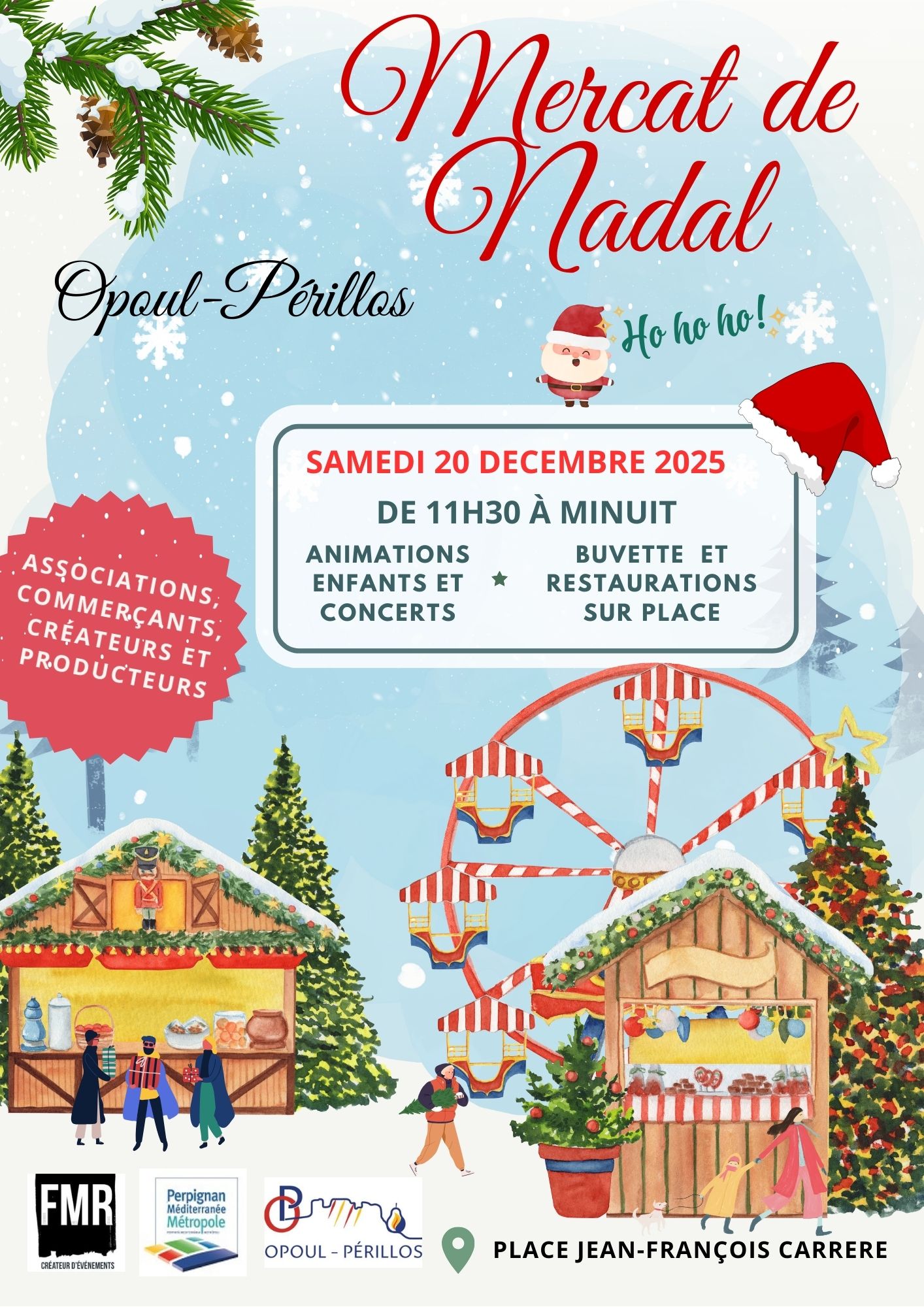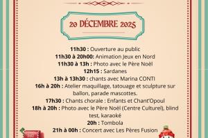 Descriptif de la manifestation : 11h30 : Ouverture au public 11h30 à 13h : Photo avec le Père Noël 11h30 à 20h00: Animation Jeux en Nord 12h15 : Sardanes 13h à 13h30 : chants avec Marina CONTI 16h à 20h : Atelier maquillage, tatouage et sculpture sur ballon, parade mascottes. 17h30 : Chants chorale : Enfants et Chant’Opoul 18h à 20h : Photo avec le Père Noël au Centre Culturel, blind test, karaoké 20h : Tombola 21h à 00h : Concert avec Les Pères Fusion