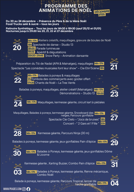 Descriptif de la manifestation : Venez fêter Noël à Prades! 14h-17h balades à poneys& maquillages 17h tombola des commerçants avec gouter offert 17h30 chants de Noël -la Tres Vents