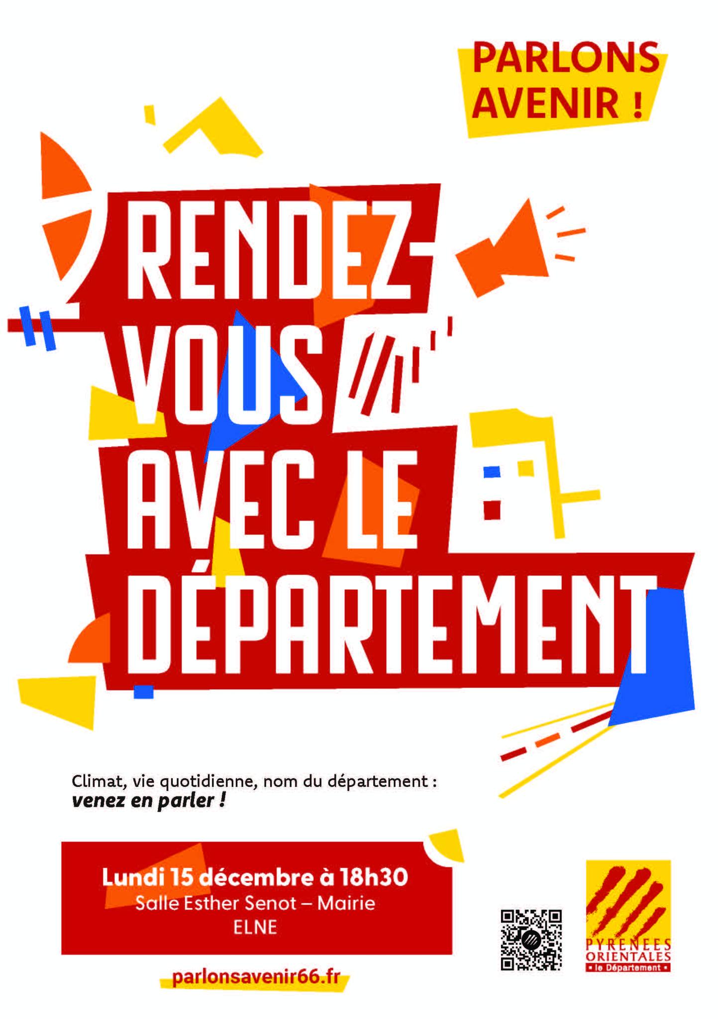 Descriptif de la manifestation : Climat, vie quotidienne, nom du département : venez en parler !Lundi 15 décembre à 18h30 Salle Esther Senot – Mairie. Santé, emploi, logement, alimentation, économie, éducation, vie quotidienne, sécurité, adaptation au changement climatique... Quel avenir voulez-vous pour les Pyrénées-Orientales ? Pour en débattre, le Département vous donne rendez-vous.