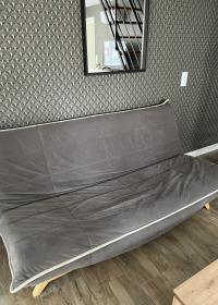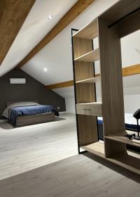 À l’étage, une grande chambre comprenant un lit double ainsi qu’un lit simple. Nous mettons également à disposition un lit parapluie.