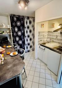 Une kitchenette bien équipée : réfrigérateur, plaques de cuisson, micro-ondes, cafetière, grille-pain, bouilloire, vaisselle… La salle de bain est un vrai plus !