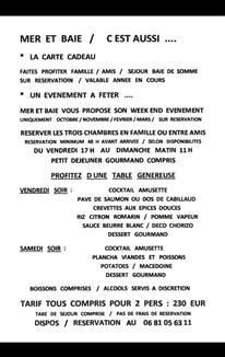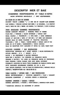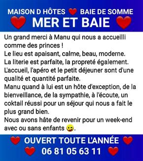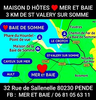 | COEUR BAIE DE SOMME / Ouvert Toute l'Année / 3 Km St Valery sur Somme / Proche Cayeux / Hourdel / Crotoy / Ault / Mers / Tréport. TROIS SPACIEUSES CHAMBRES INDEPENDANTES / Grand Confort Privatif / Plain Pied / Terrasse / Parking Privé Fermé. IDEAL COUPLE ( + 1 Enf / Ado ) / Sans Animaux. Grand Lit 160 x 200 / Sofa Lit 90 x 190 / Salle de Bains Italienne / Toilettes / TV / Frigo / M.Ondes / Linge Lit et Bains / S. Cheveux / Lit BB. TARIF NUITEE CHAMBRE : 80 € / Petit Déjeuner Compris. TABLE d'HOTES Bistronomique / Option Soir / Menu : 25 € / Pers / Boissons Comprises. LOCATION / Nuitée / Week End / Semaine / Demi Pension / Location 2/3 Chambres Famille / Amis. Taxe de Séjour Incluse / Réservation Sans Frais / Ménage Inclus. Facebook : MER ET BAIE / 06 81 05 63 11 |