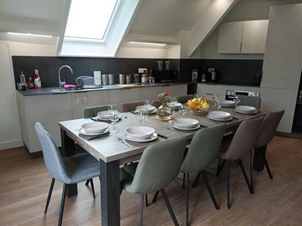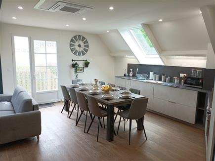 | A Saint Valery sur Somme, proche des commerces et du centre ville, un grand pavillon entièrement rénovée disposant de 3 appartements. Au rez-de-chaussée, l'appartement Hélène se compose d'une entrée sur le séjour/salon donnant sur une terasse avec salon de jardin barbecue, une cuisine entièrement équipée, une chambre avec un lit de 160 avec sa baignoire d'angle, une chambre avec 2 lits de 90 et sa salle d'eau, une chambre avec un lit de 140 et sa salle d'eau, et, une chambre avec un lit de 160 et sa salle d'eau. Jardin clos commun, salle de jeux en sous-sol avec baby-foot, table eping pong, jeux de société. A l'exterieur, jeux de badminton portique Lits faits, linge de toilette fourni, menage inclus. Parking privé |