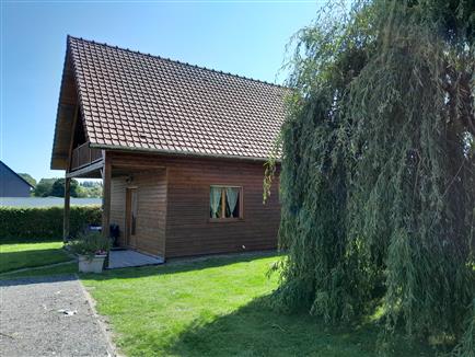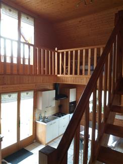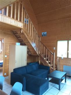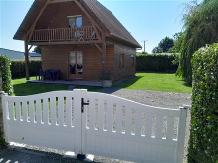 | Agréable maison en ossature bois, style chalet avec parking devant, beau jardin clos et arboré. Comprenant un espace cuisine équipé et aménagé, un séjour. une SDE et un WC indépendant. Une chambre avec 1 lit en 140. A l'étage : mezzanine avec un clic clac. Balcon avec salon de jardin. 1 grande chambre avec un lit en 140. Equipement bébé |