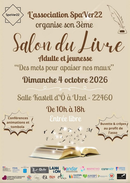 Salon du livre « Des mots pour apaiser nos maux » L’association SpaVer22 organise son 3ème salon du livre « Des mots pour apaiser nos maux ». Ce salon offrira aux lecteurs, petits et grands, tous les styles de lecture (romans, policiers, Feel good, bandes dessinées, illustrations, poésie, santé…). Plus de 50 auteurs, illustrateurs, maisons d’édition, créateurs… présents. De nombreuses conférences, ateliers et animations tout au long de la journée sur différentes thématiques (atelier halloween pour enfants, handicap invisible, santé, confiance en soi, violences conjugales et vulnérabilité avec notre référente ex-policière…).