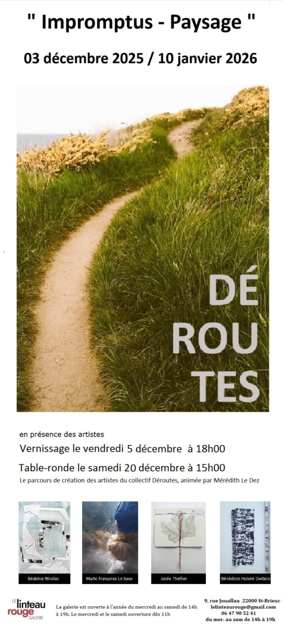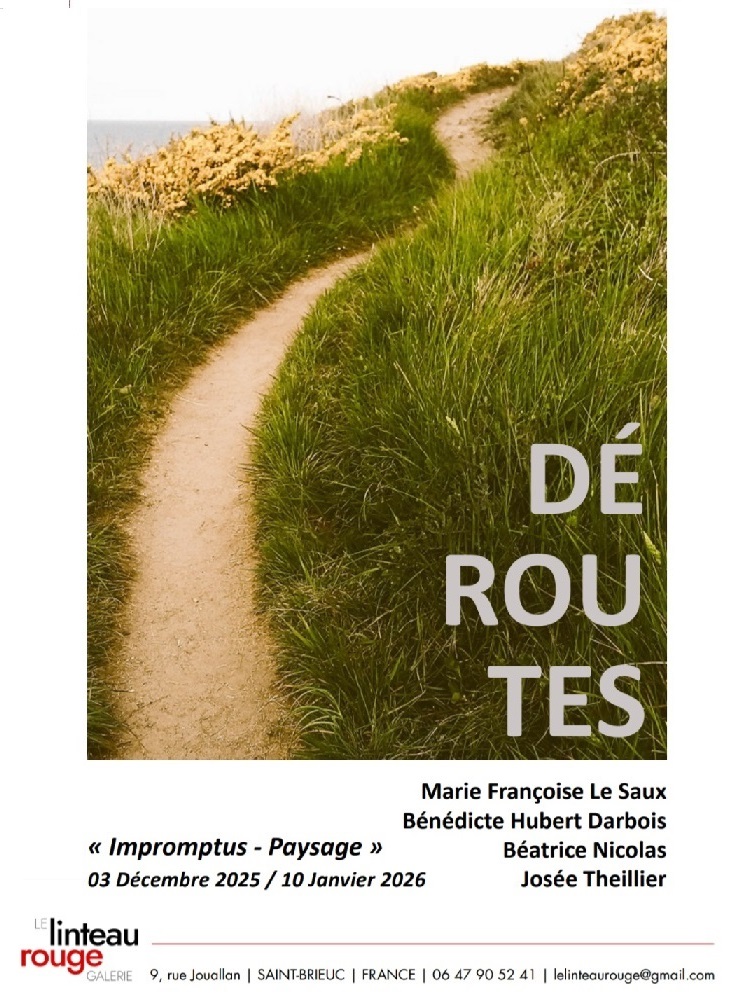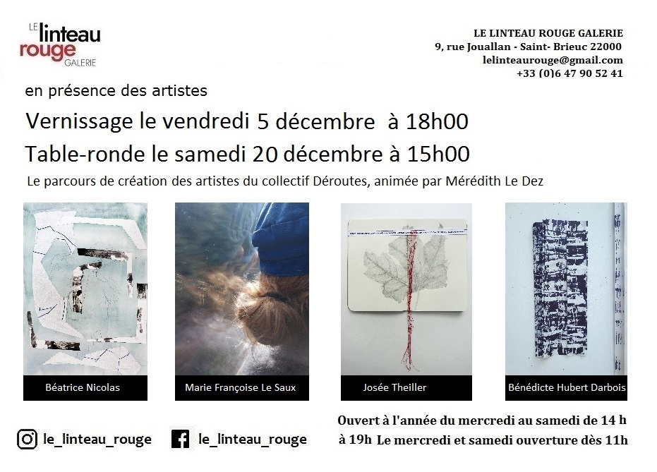 Le collectif Déroutes a été créé en 2021 par quatre femmes artistes désireuses d’articuler leur quatre univers plastiques. Ces directions personnelles, singulières, fortes qui constituent leur identité ne les divisent pas, mais les soudent et leur permettent une ouverture plus large, plus confiante vers la sphère artistique. Le collectif c’est aussi un espace de liberté qui les amène parfois à exposer individuellement ou à instaurer des dialogues avec d’autres plasticiens mais aussi danseurs, poètes, musiciens, sans pour autant perdre de vue l’ancrage du collectif. Déroutes est le lieu des échanges nécessaires, des confrontations parfois vives, des questionnements, de l’expression des doutes, tellement présents malgré, et peut-être du fait de longues années de travail. Le collectif pour se ressourcer donc. Pour avancer.