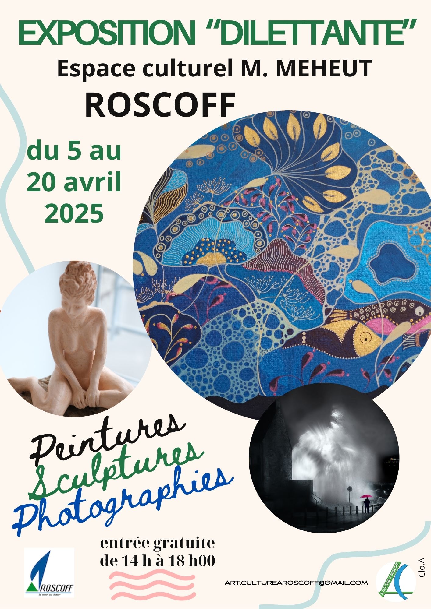 "Dilettante", exposition d'artistes amateurs (photographies, peintures et sculptures), organisée par Art et Culture à Roscoff. Cette exposition est ouverte (adhérents ou non) aux "artistes" totalement amateurs qui s'adonnent pour leur plaisir, leur passe-temps, leur hobby, à l'art pictural, à la sculpture et à la photographie...