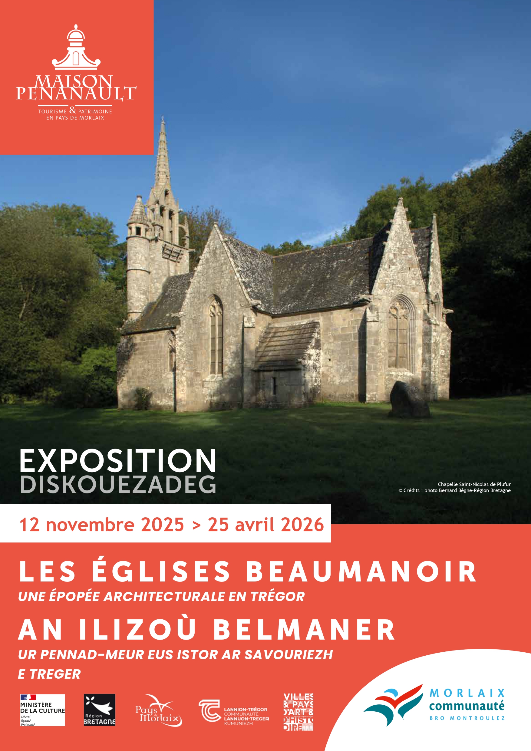 À la charnière des XVe et XVIe siècles, la partie occidentale de l’évêché de Tréguier et la frange orientale de l’évêché de Léon se couvrent d’un manteau d’églises et de chapelles aux caractéristiques architecturales singulières et novatrices que la tradition attribue à l’atelier Beaumanoir de Morlaix. Joyaux architectural niché au coeur de la campagne trégorroise, la chapelle Saint-Nicolas de Plufur illustre, à bien des égards, la qualité et la valeur de cet héritage architectural unique. De part et d’autre de la ville de Morlaix, de Guimiliau à Ploulec’h et de Plougonver à Henvic, au coeur d’un territoire prospère, sculpteurs, maîtres-verriers, charpentiers, tailleurs de pierre oeuvrent sans relâche sur de multiples chantiers impulsés par de généreux mécènes. Ils contribuent à la formation d’un pan du patrimoine bâti de Bretagne dont la valeur inestimable a été mise en lumière lors de l’incendie de l’église Notre-Dame de la Merci de Trémel en juin 2016. Fruit d’une collaboration inédite entre le Pays d’art et d’histoire du Trégor, le Pays d’art et d’histoire du Pays de Morlaix et Morlaix Communauté, cette exposition explore les ressorts et les contours d’une épopée architecturale qui distingue l’histoire et le patrimoine religieux du Trégor.
