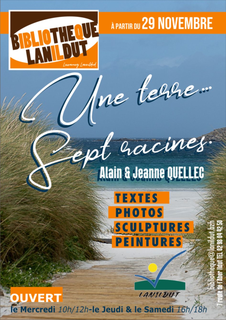 Exposition "Une terre... sept racines," consacrée aux sept saints fondateurs de la Bretagne, au travers des œuvres de Jeanne et Alain Quellec de Lanildut. L'expo met en lumière par la peinture et la sculpture, les figures légendaires de Brieuc, Malo, Samson, Patern, Corentin, Pol Aurélien et Tugdual, dont les vies et les pèlerinages ont façonné l'identité spirituelle et culturelle de la Bretagne. Une invitation à un voyage artistique et symbolique au cœur des racines bretonnes.