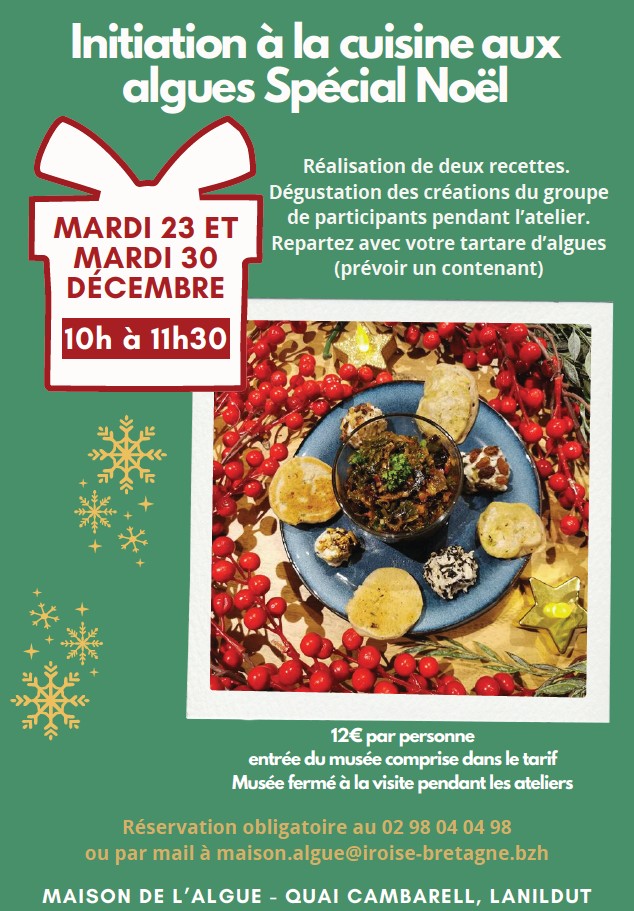 Profitez des vacances de Noël pour apporter une touche iodée à vos repas de fêtes grâce à un atelier d’initiation à la cuisine aux algues. Vous repartirez avec un tartare d’algues qui ravira petits et grands et dégusterez différentes spécialités aux algues. Quelques idées pour ajouter des saveurs marines à votre table de fêtes !