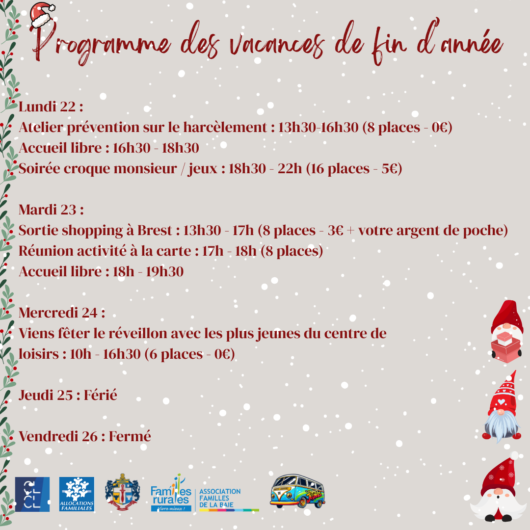 Voici le programme d'animation de l'espace jeunes de Plouider (association Familles de la Baie) qui est proposé du lundi 22 décembre 2025 au vendredi 2 janvier 2026. Diverses activités sont proposées durant cette période pour divertir tous les adolescents âgés de 11 à 17 ans de CLCL.