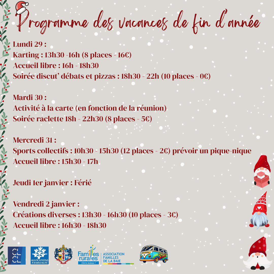 Programme des vacances de fin d'année de l'espace jeunes Plouider (Familles de la Baie)