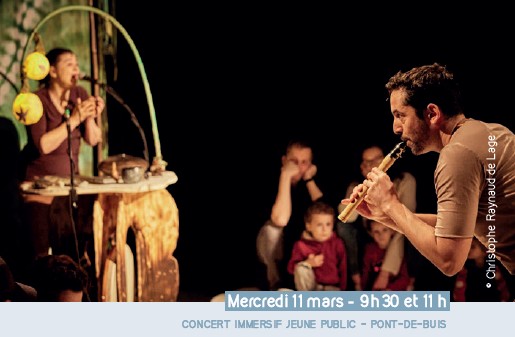 Dans ce spectacle, deux musiciens-chanteurs puisent dans les racines des musiques du monde. Installés sur des îlots au coeur de l’espace scénique, petits et grands, au gré de leurs envies, peuvent participer au geste artistique, s’emparer d’objets évocateurs d’une nature imaginaire ou simplement se laisser porter par les voix et la musique.