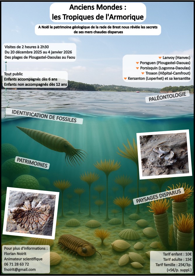 La visite propose de découvrir la plage de Kersanton, lieu à l’origine du nom de la kersantite, et ses environs. Nous y observerons et verrons comment reconnaître les principaux types de roches et les grands groupes d’animaux fossiles. Nous pourrons constater qu’ils sont les témoins d’événements importants qui ont profondément impacté l’histoire de la vie sur Terre et les paysages de la Bretagne. Nous découvrirons enfin les vestiges des anciennes carrières de kersantite, témoins d’une longue histoire de l’exploitation de cette roche dans le Finistère qui a culminé au 20ème siècle.