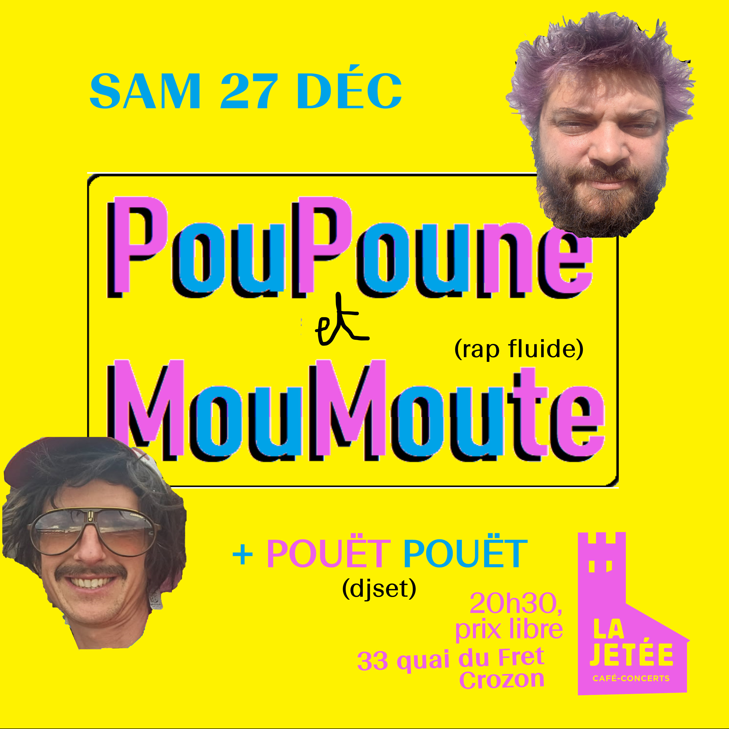 Pounz + El Maout = PouPoune et MouMoute PouPoune et MouMoute c'est d'un côté Pounz; un Mc à la plume poétique, à l'esprit punk et un humaniste dans l'âme. De l'autre El Maout, beat boxeur et beat maker, vocaliste aux influences multiples qui n'aime pas trop la monoculture. Du hip hop à l’esprit ouvert, nouveau duo en Finistère ! suivi de POUËT POUËT (djset / le Fret)