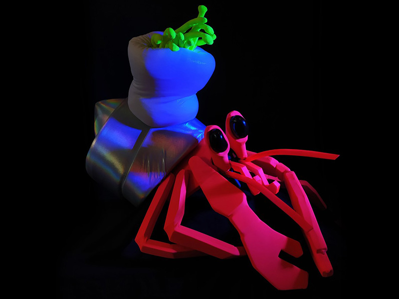 Coquille Diamant mêle des compositions de musique électronique, de la marionnette et du mapping vidéo. Marc de Blanchard explore avec magie et poésie le monde marin, ou plus précisément la faune cachée des mares résiduelles. Il propose une vision très pop et fantastique de cette vie microscopique qui nous entoure. On s’émerveille devant cet univers multicolore et surprenant, incarné par des marionnettes à la morphologie étonnante !