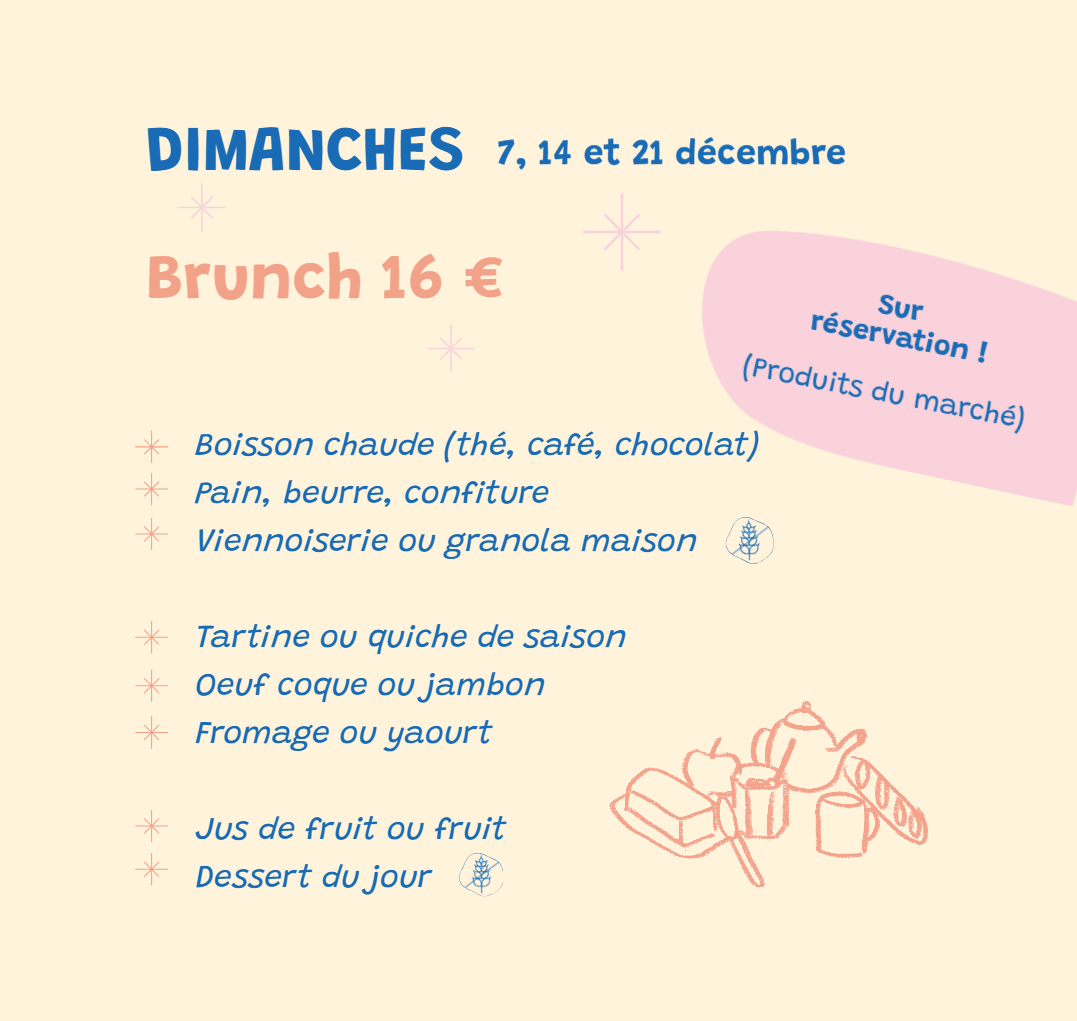 Servie entre 11h et 15h, et sur réservation pour garantir la fraicheur des produits du marché, la formule unique à 16€ comprend une base de petit déjeuner classique : boisson chaude, pain beurre confiture et viennoiserie ou brioche ou granola maison, fruit ou jus puis une préparation salée de saison, accompagnée d'un oeuf coque ou de jambon, de fromage ou d'un yaourt, et se termine par un déssert maison !