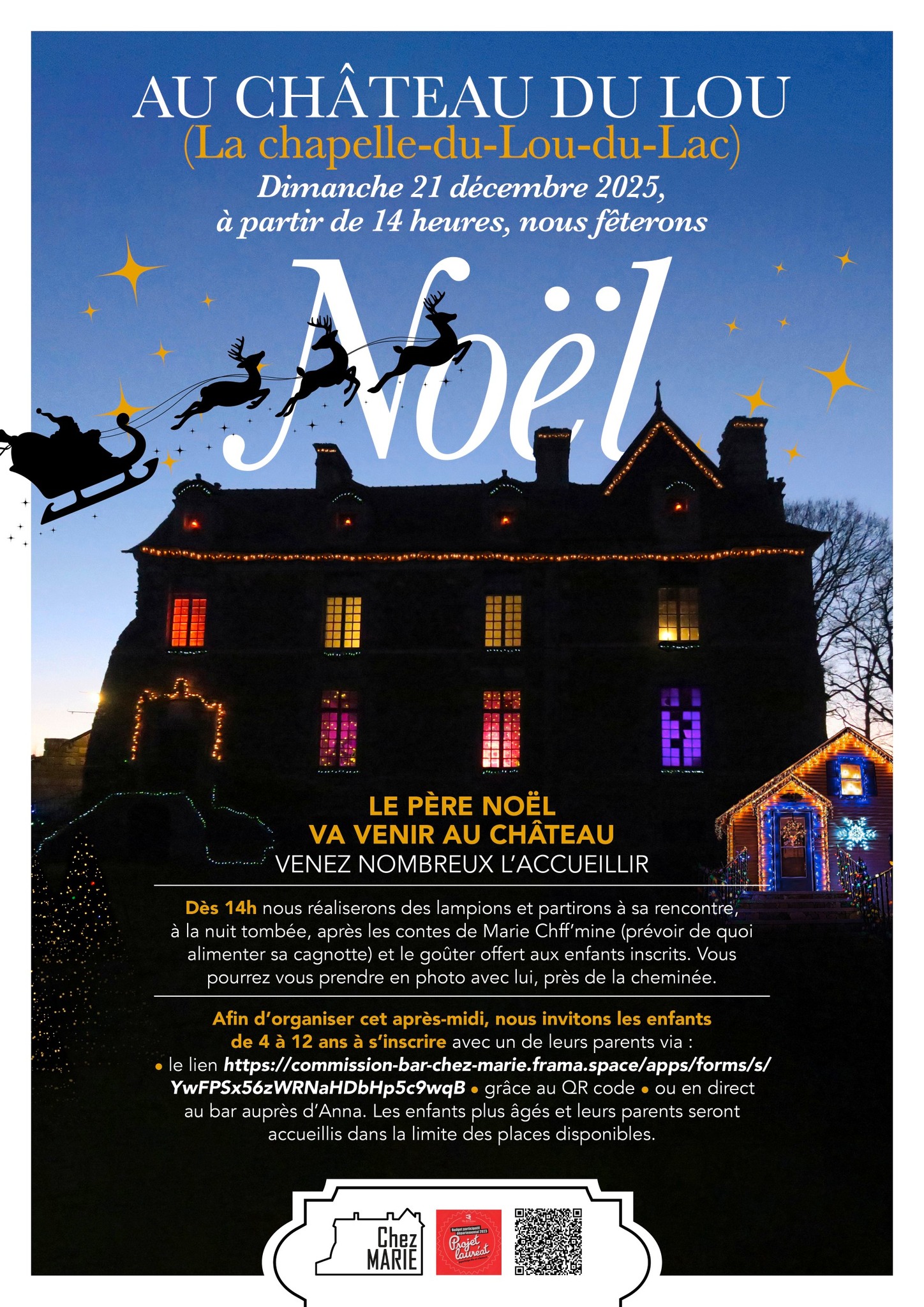 Au programme : 14h à 16h : atelier confection de lampions 16h à 16h30 : goûter (chocolat, madeleine) pour les enfants 16h30-17h30 : animation Marie Chiffmine (pensez à amener de quoi remplir son chapeau) 17h30 : balade aux lampions autour du château à la recherche du père Noël 18h : arrivée du père Noël 18h-19h : séance photos avec le père Noël près de la cheminée du salon du château