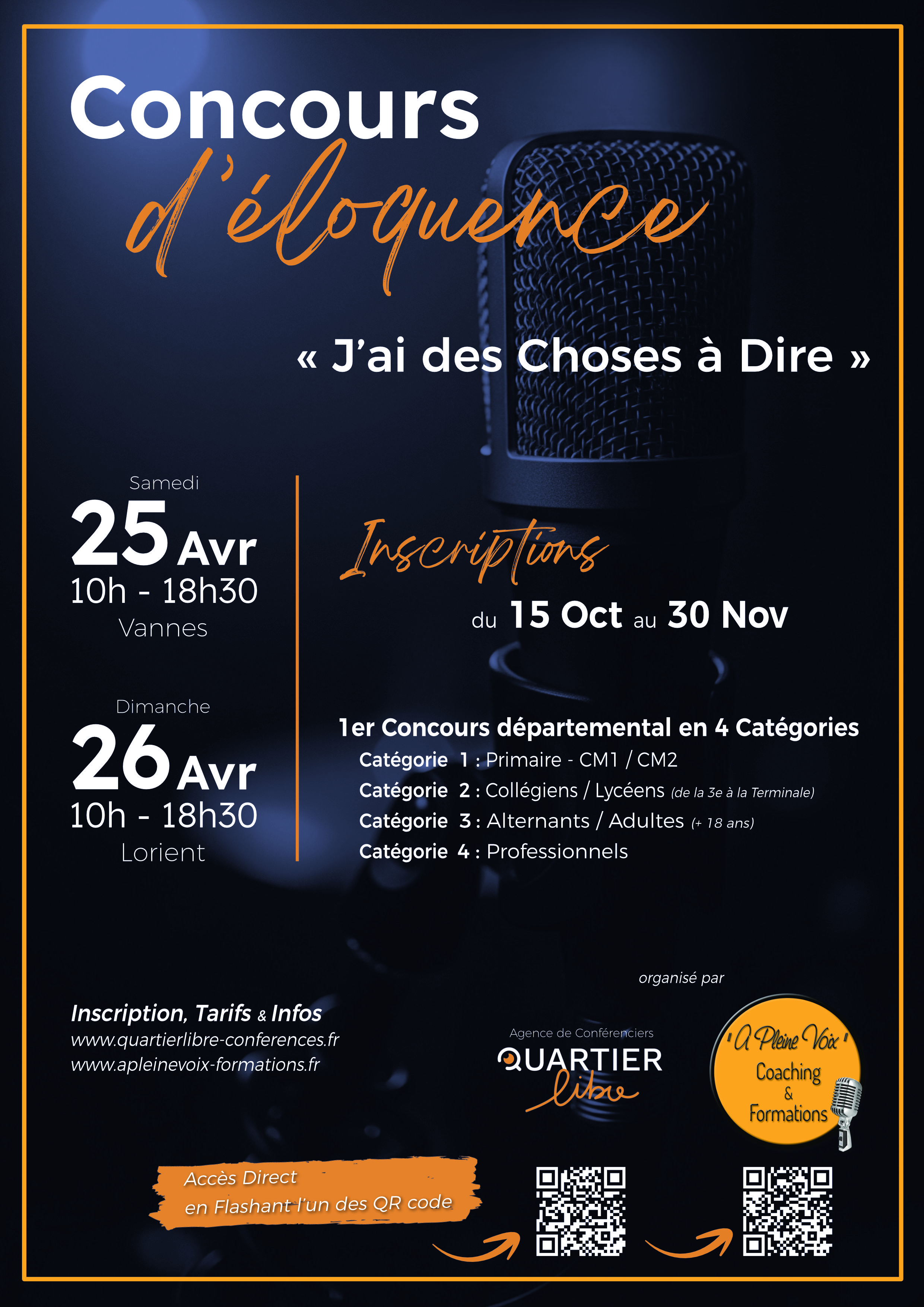 ? Que vous soyez élève, étudiant, amateur passionné ou professionnel aguerri, ce concours est l’occasion unique de partager vos idées, de progresser dans votre art oratoire et de vivre une expérience collective inoubliable. À vous de prendre la parole… et de faire vibrer le public !