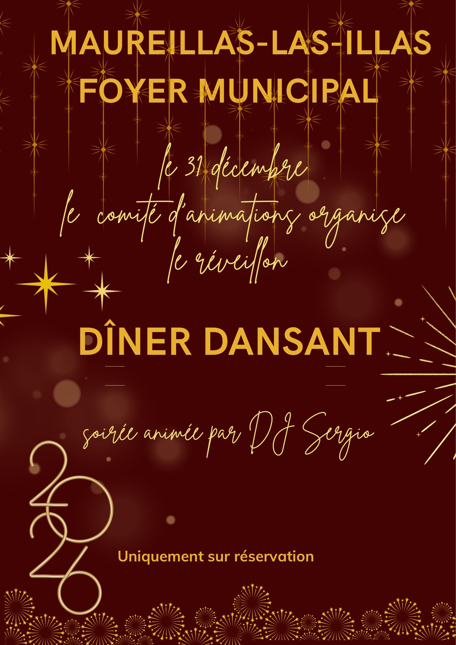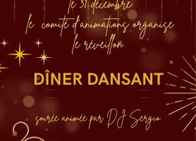 Descriptif de la manifestation : Dîner dansant réveillon Saint Sylvestre, animation DJ Sergio, soirée organisée par le Comité d'animation. Uniquement sur réservation.