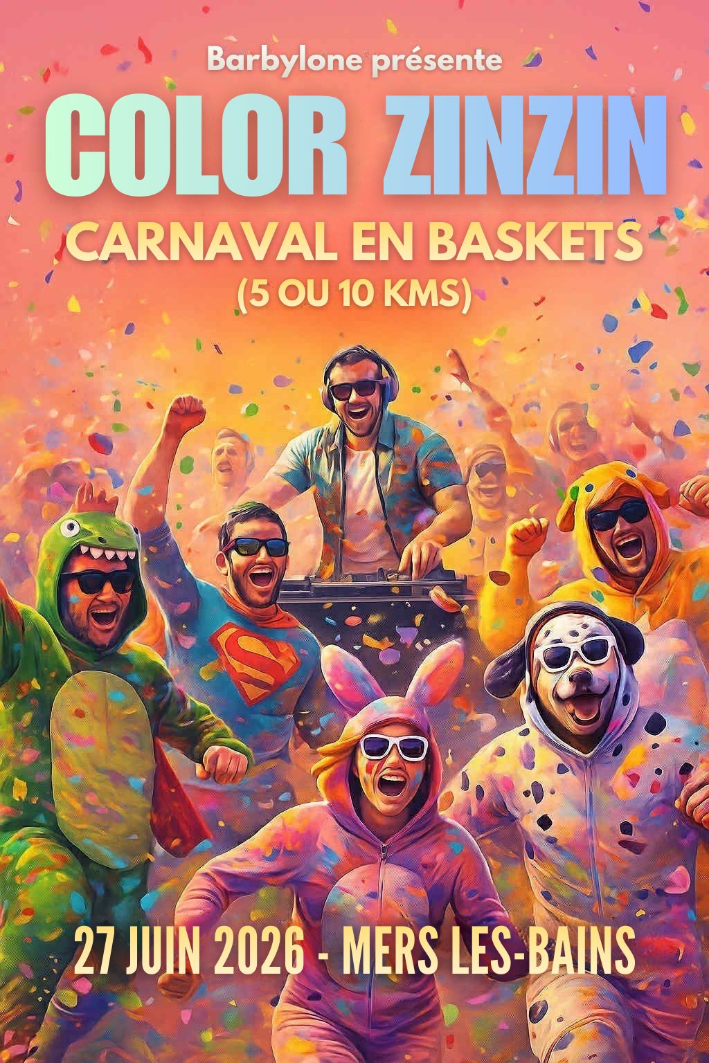 Carnaval en baskets (5 ou 10 Km). Costumes, musique, fiesta et une ambiance complètement déjantée Type : Sports et loisirs de pleine nature Catégorie : Loisirs et détente - Rencontre sportive Dates : 27/06/2026 / 27/06/2026 Contact : Mail : barbylone.mers@gmail.com |