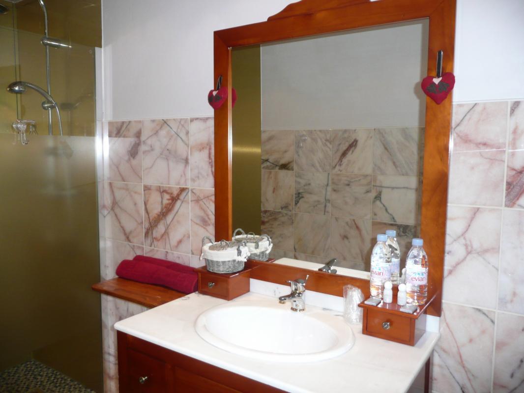 | Dans un endroit calme, 2 chambres de plain pied, dans une dépendance, chacune avec (1 lit 160) et une salle d'eau (douche au sol), avec WC. et 1 grande chambre de 25 m² avec (1 lit 160) et une salle de bains ouverte (baignoire balnéo pour 2 personnes et une douche au sol), WC indépendant. Petit déjeuner servi dans la véranda ou en terrasse. Jardin (2400 m²) avec piscine couverte chauffée (14x5 m) ouverte de mai à sept, sur demande. Jacuzzi et sauna avec supplément. Taxe de séjour incluse. | ||||
