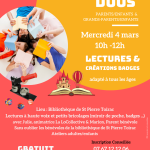 le 03/03/2026 de 10:30 à 11:00Atelier - Lecture Enfants - Famille - Littérature Gratuit ![]() |