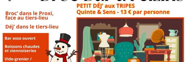 Tarifs : Gratuit exposant 2 euros le m Tarif adulte : 13,00 € PDj tripes Bar d’antan avec boissons chaudes et tripes. Brocante et vide-dressing et marché d’artisans d’art. Tables non fournies. (petit dej aux tripes) |