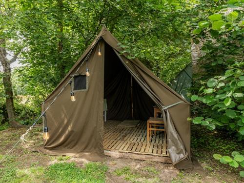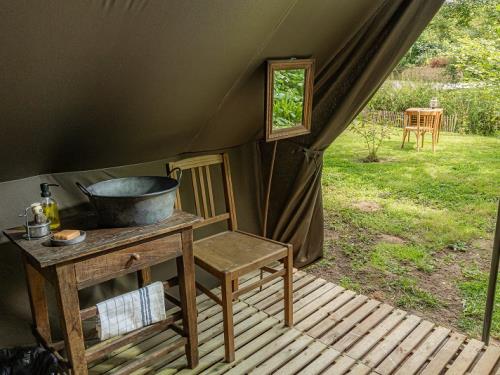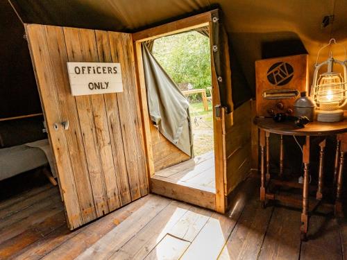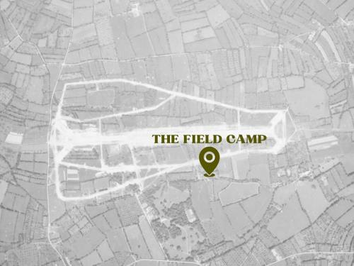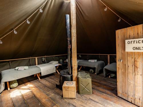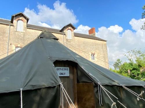 | Tente Pyramidale US de la Seconde Guerre Mondiale. Lits de camp, sanitaires de campagne avec toilettes sèches et douche (eau chauffée). Située sur le site d'un ancien aérodrome américain. | |