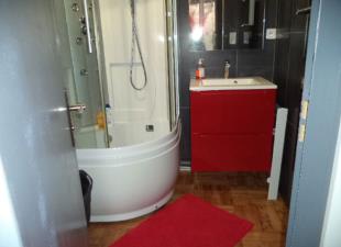 Une salle d'eau avec vasque, douche (bac surélevé), rangement. Lave-linge dans placard/couloir.