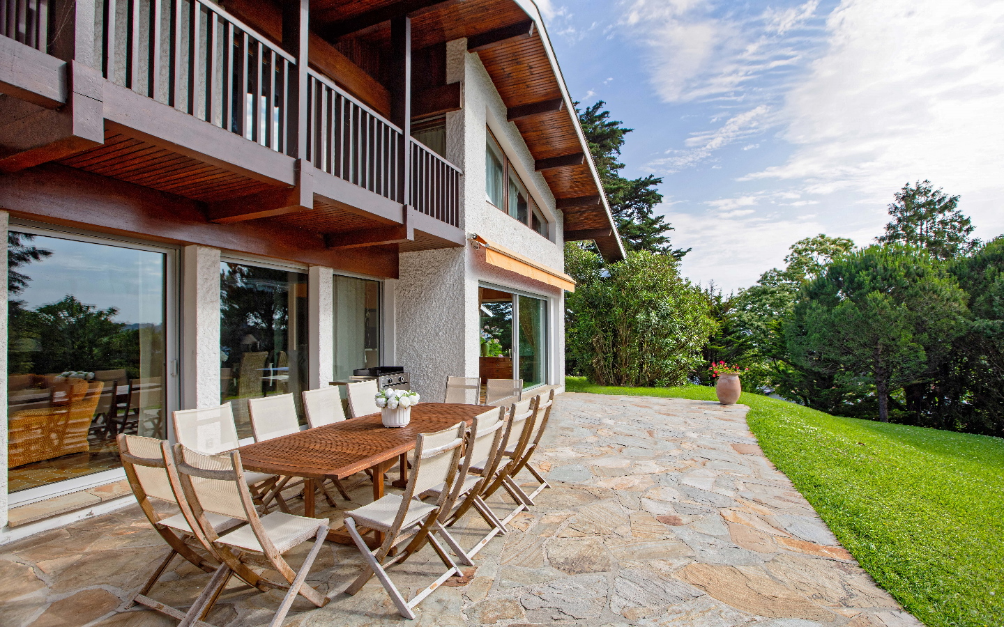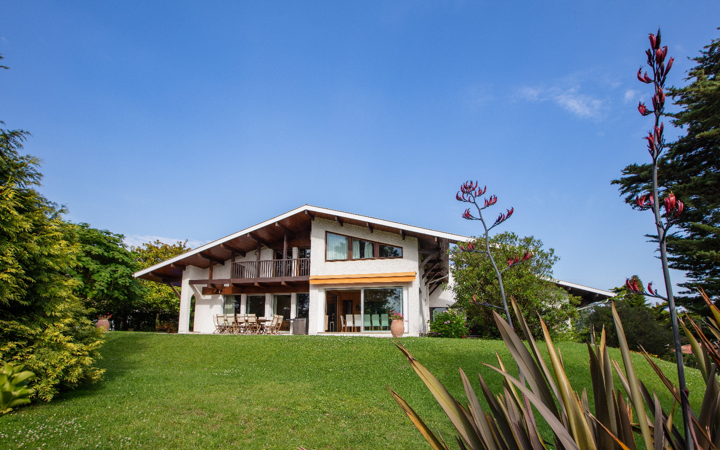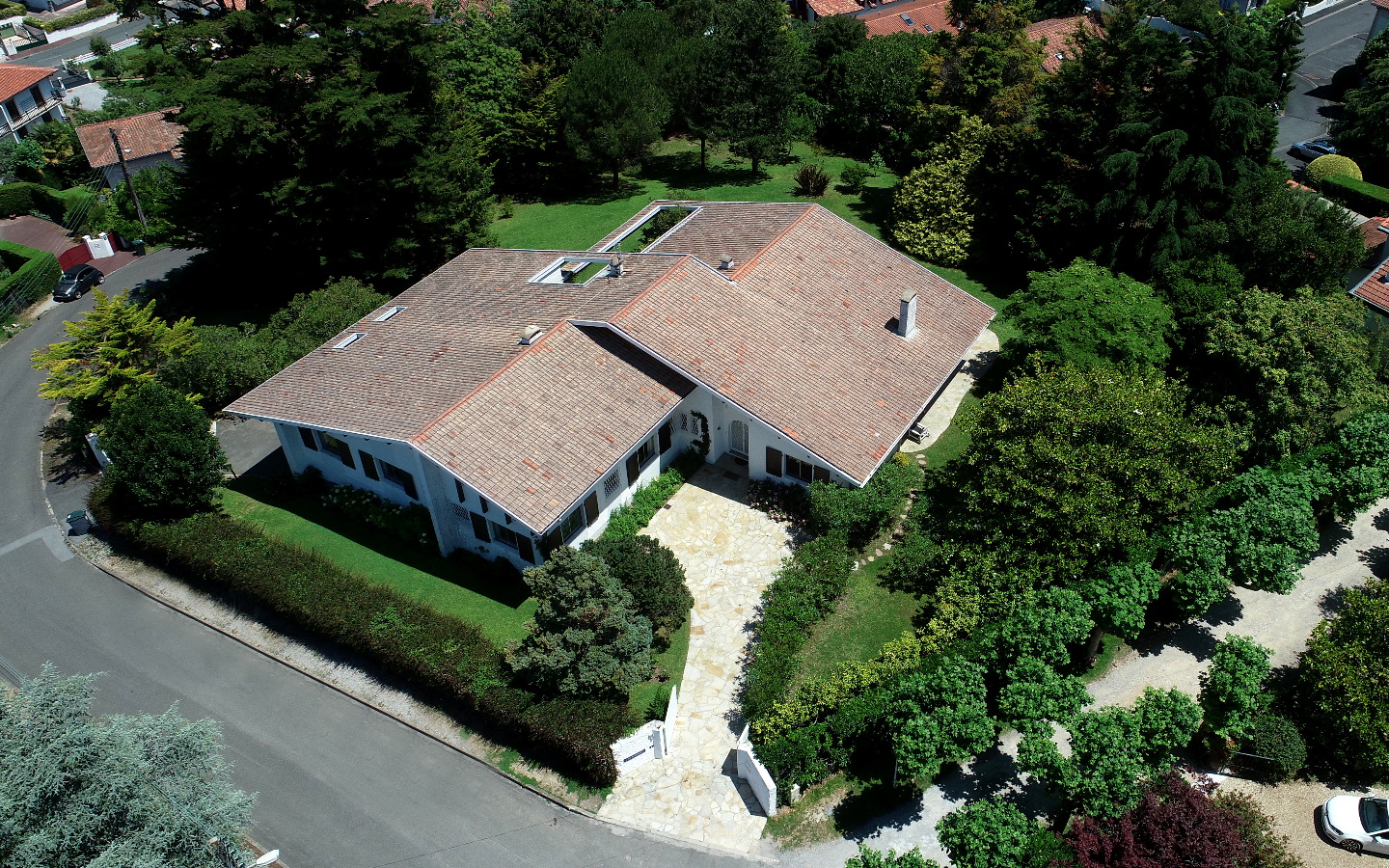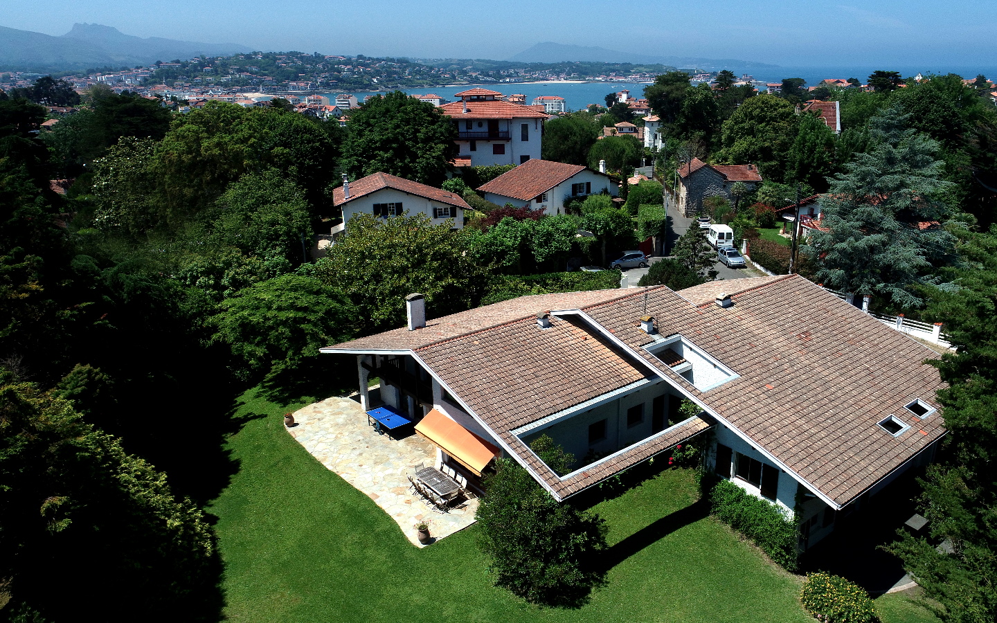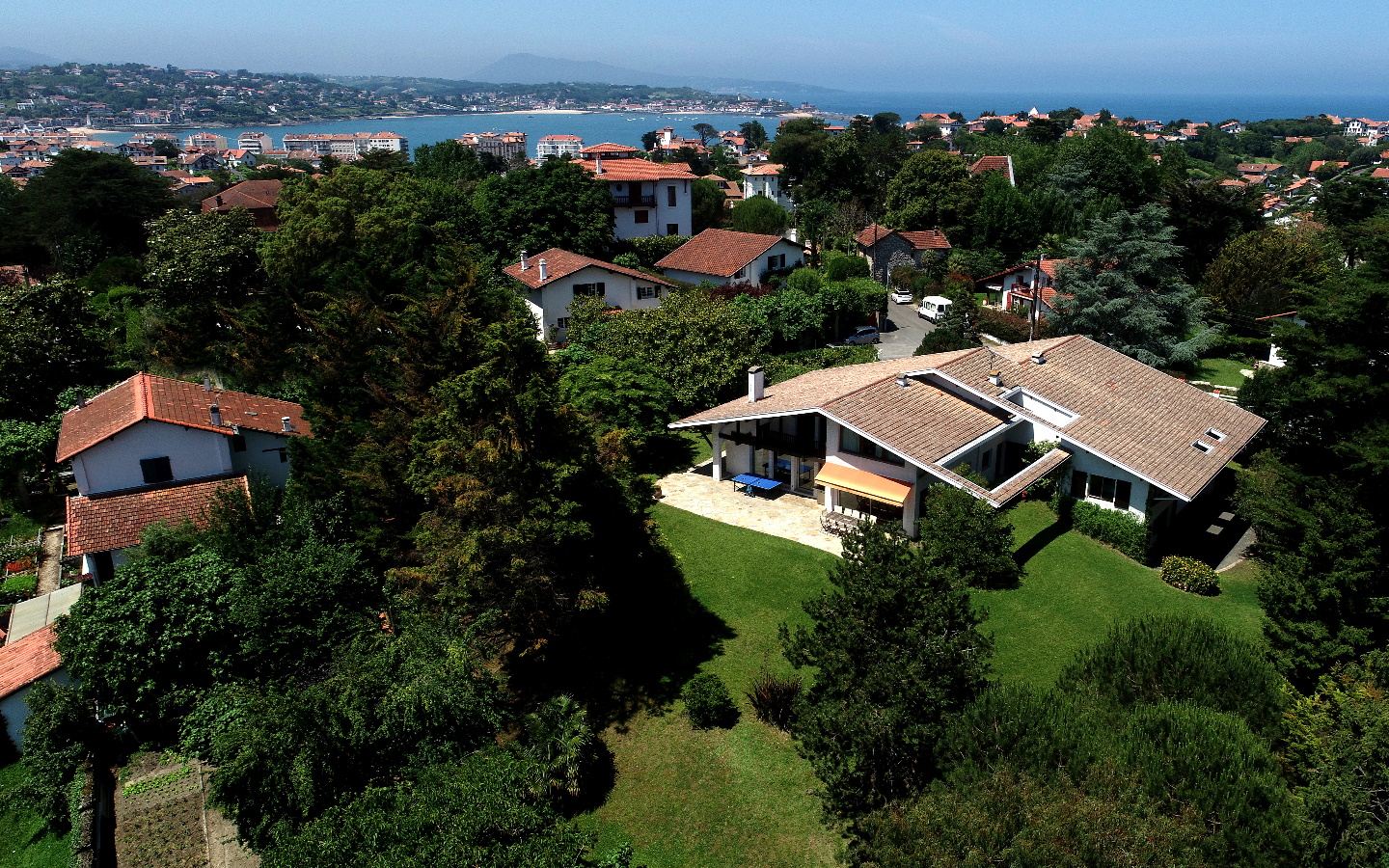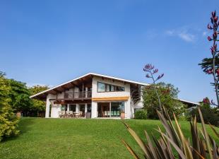 À 10 mn à pied de la plage de Saint-Jean-De-Luz et 20 mn en voiture de l’aéroport de Biarritz, maison d’architecte de 417 m2 de plain pied avec un parc paysagé de 3400 m2 protégé, sans vis-à-vis, et terrasse ensoleillée de 50 m2.